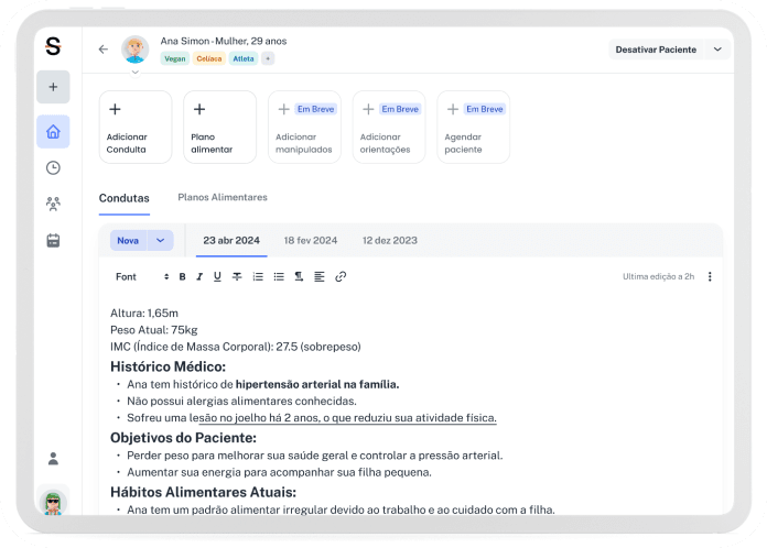 - Acesse o histórico de todos os planos alimentares já construídos por paciente