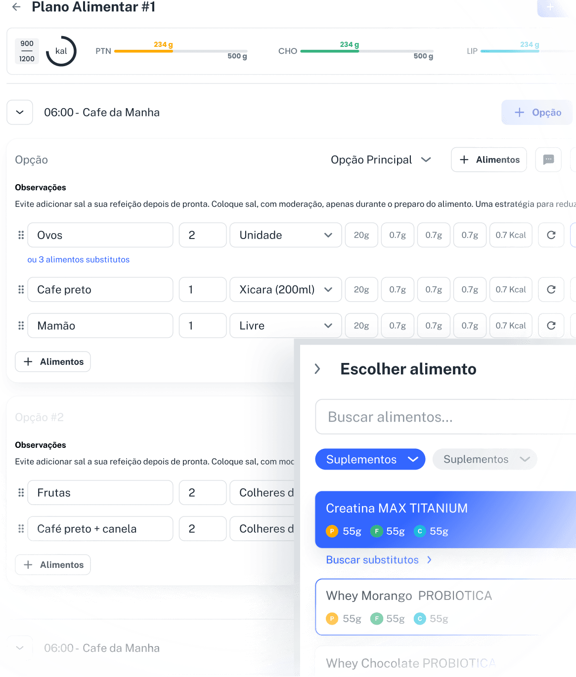- Salve e registre padrões de refeições já prontos e criadas por você para facilitar a criação de mais planos alimentares